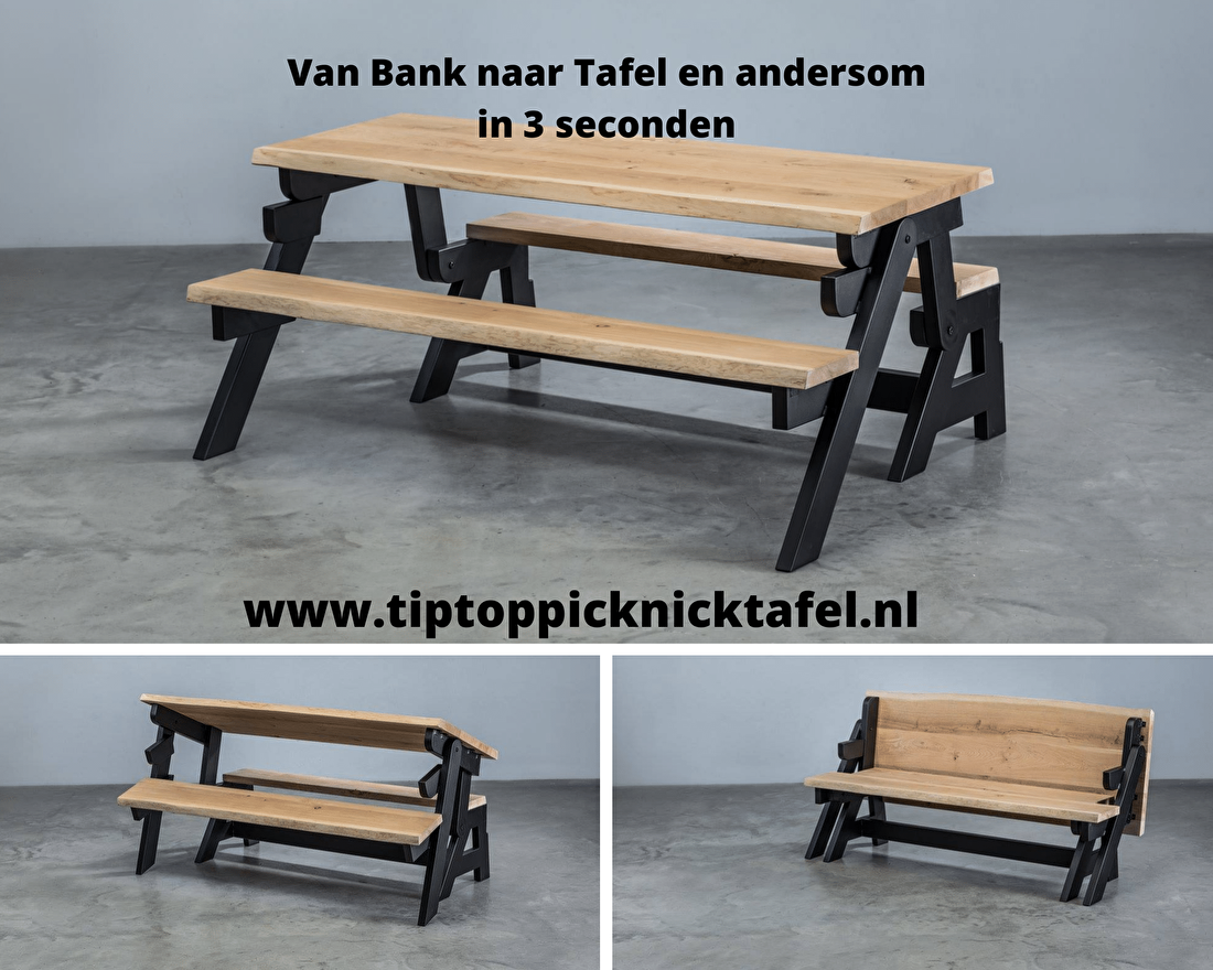 Onze uitvoering is een opvouwbare picknicktafel die verandert van bank naar tafel. - We leveren volledig gemonteerd